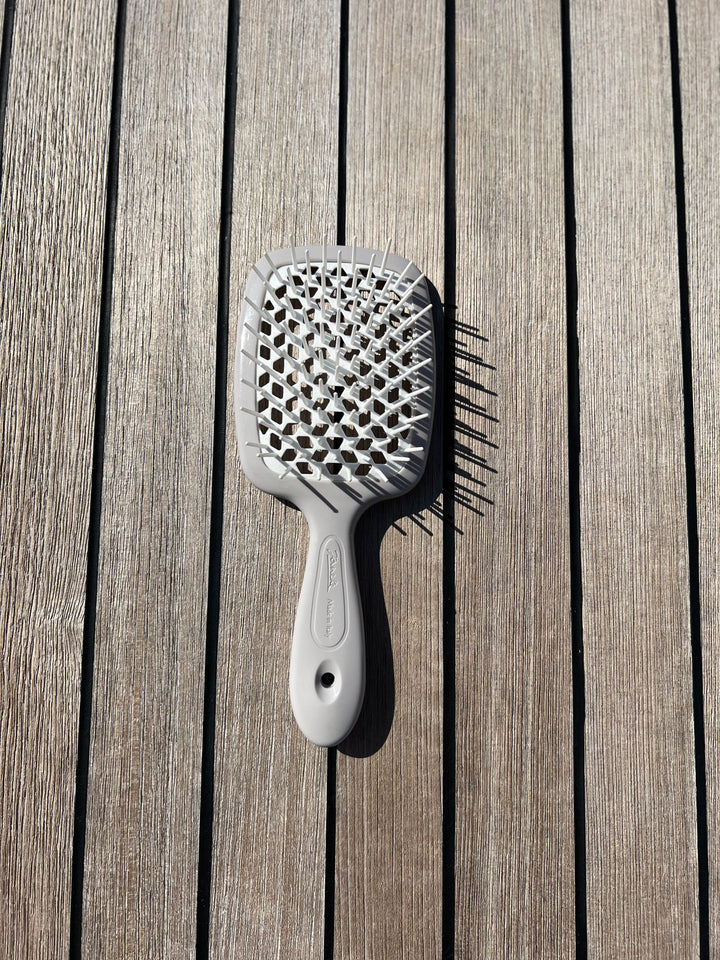 Superbrush gently and effectively detangles thanks to its soft tips and its particular patented beehive perforation allows for very quick drying. Also perfect in the shower or with damp hair, to apply the cream and detangle in just a few steps. Very useful for delicate baby hair and on extensions: its soft tips detangle in a super delicate way! The pneumatic base of the brush has a particular patented beehive perforation. The hot air of the hairdryer is thus distributed evenly to dry in a few steps without stressing the hair.