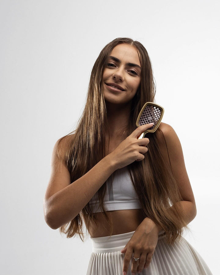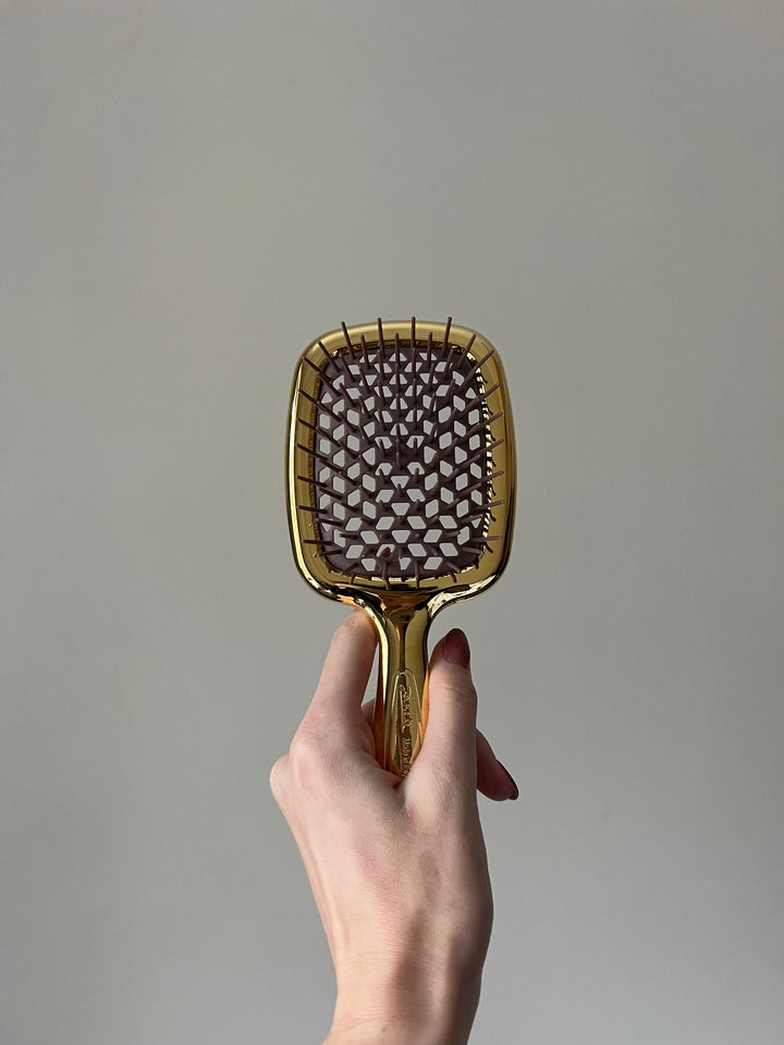 This gold massage brush with a brown center is part of Janeke's limited-edition collection. Designed to reduce static and provide a comfortable brushing experience, it gently glides through the hair for effortless styling.