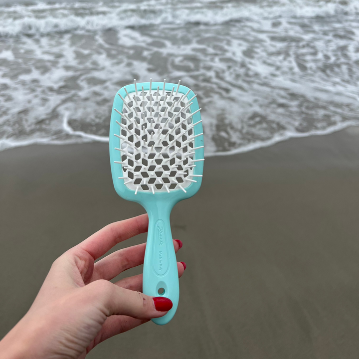 Superbrush gently and effectively detangles thanks to its soft tips and its particular patented beehive perforation allows for very quick drying. Also perfect in the shower or with damp hair, to apply the cream and detangle in just a few steps. Very useful for delicate baby hair and on extensions: its soft tips detangle in a super delicate way! The pneumatic base of the brush has a particular patented beehive perforation. The hot air of the hairdryer is thus distributed evenly to dry in a few steps without stressing the hair.