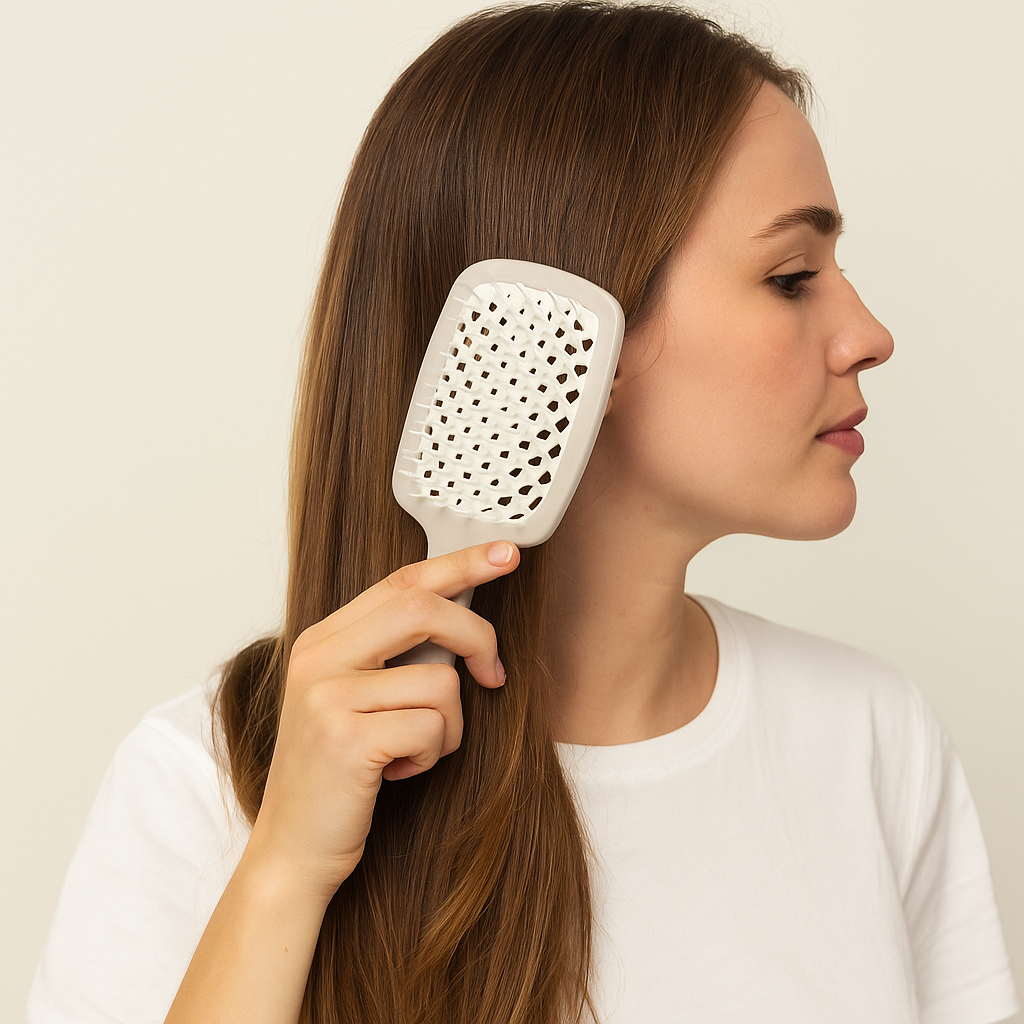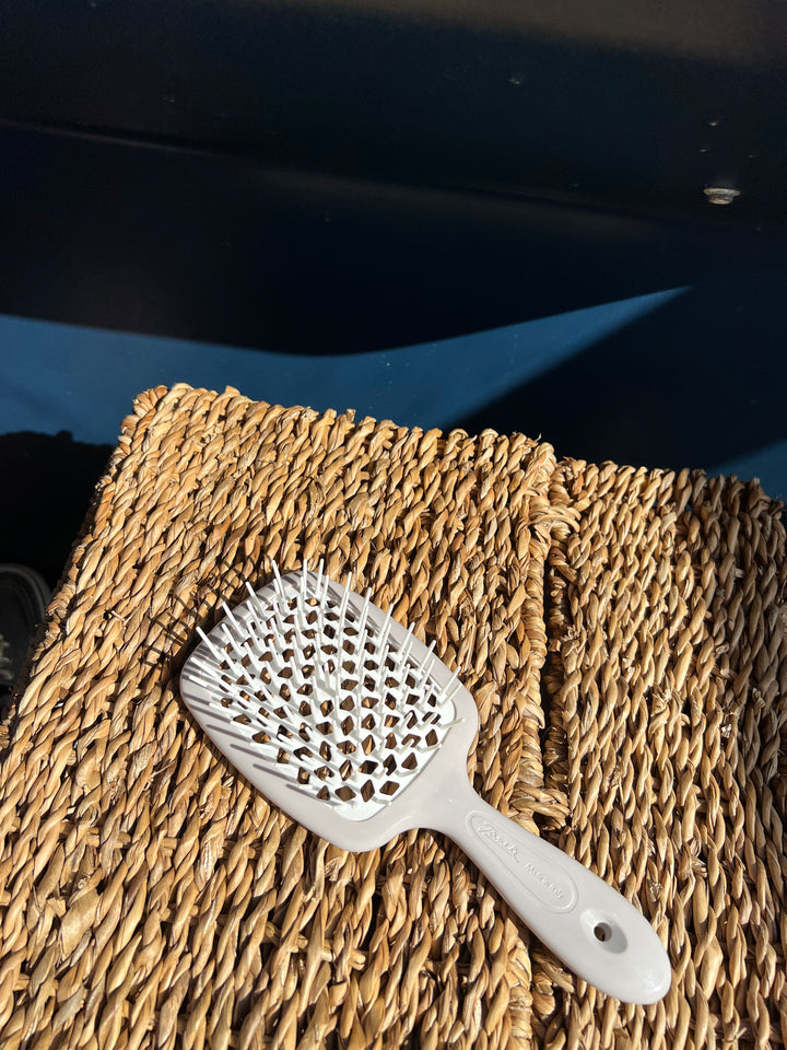Superbrush gently and effectively detangles thanks to its soft tips and its particular patented beehive perforation allows for very quick drying. Also perfect in the shower or with damp hair, to apply the cream and detangle in just a few steps. Very useful for delicate baby hair and on extensions: its soft tips detangle in a super delicate way! The pneumatic base of the brush has a particular patented beehive perforation. The hot air of the hairdryer is thus distributed evenly to dry in a few steps without stressing the hair.
