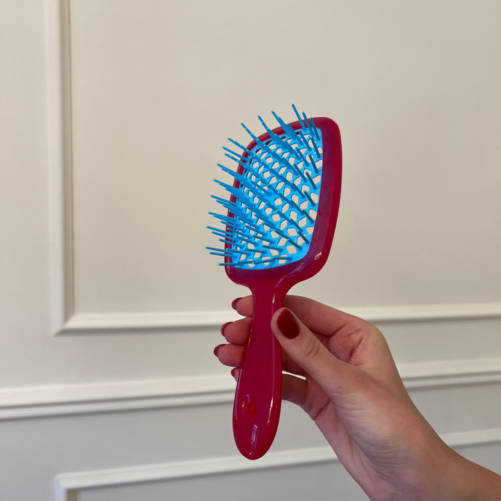 Superbrush gently and effectively detangles thanks to its soft tips and its particular patented beehive perforation allows for very quick drying. Also perfect in the shower or with damp hair, to apply the cream and detangle in just a few steps. Very useful for delicate baby hair and on extensions: its soft tips detangle in a super delicate way! The pneumatic base of the brush has a particular patented beehive perforation. The hot air of the hairdryer is thus distributed evenly to dry in a few steps without stressing the hair.
